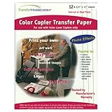 High-resolution iron-and-peel transfer paper. Print your own artwork, snapshots, scanned images, internet graphics, logos, patterns, and more. Transfer to light colored t-shirts, quilt blocks, home decor items, and more. Compatible with most polyesters, cottons, and poly-cotton blends. Tightly woven fabric provides the best image resolution. Mach ine washand dry. For use with color laser copiers. 12 per package.